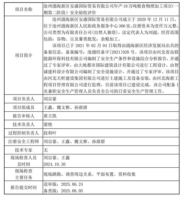 沧州渤海新区安盛国际贸易有限公司年产10万吨粮食物理加工项目(一期第二阶段)安全验收评价