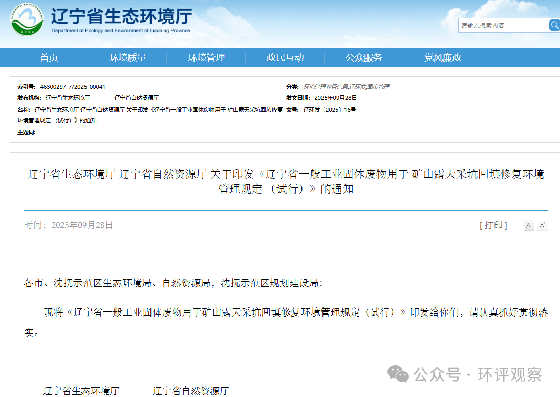 环境厅自然资源厅印发《一般工业固体废物用于 矿山露天采坑回填修复环境管理规定 (试行)》