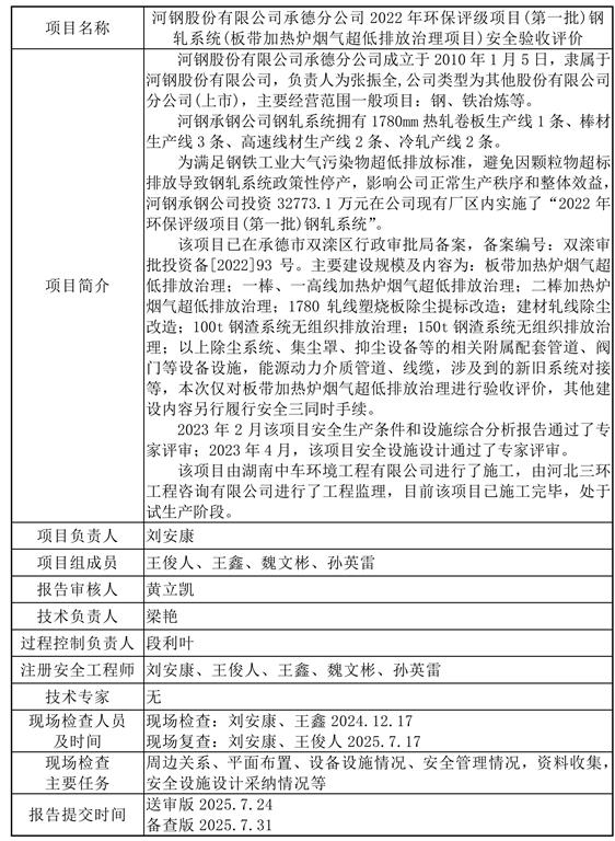河钢股份有限公司承德分公司2022年环保评级项目(第一批)钢轧系统(板带加热炉烟气超低排放治理项目)安全验收评价